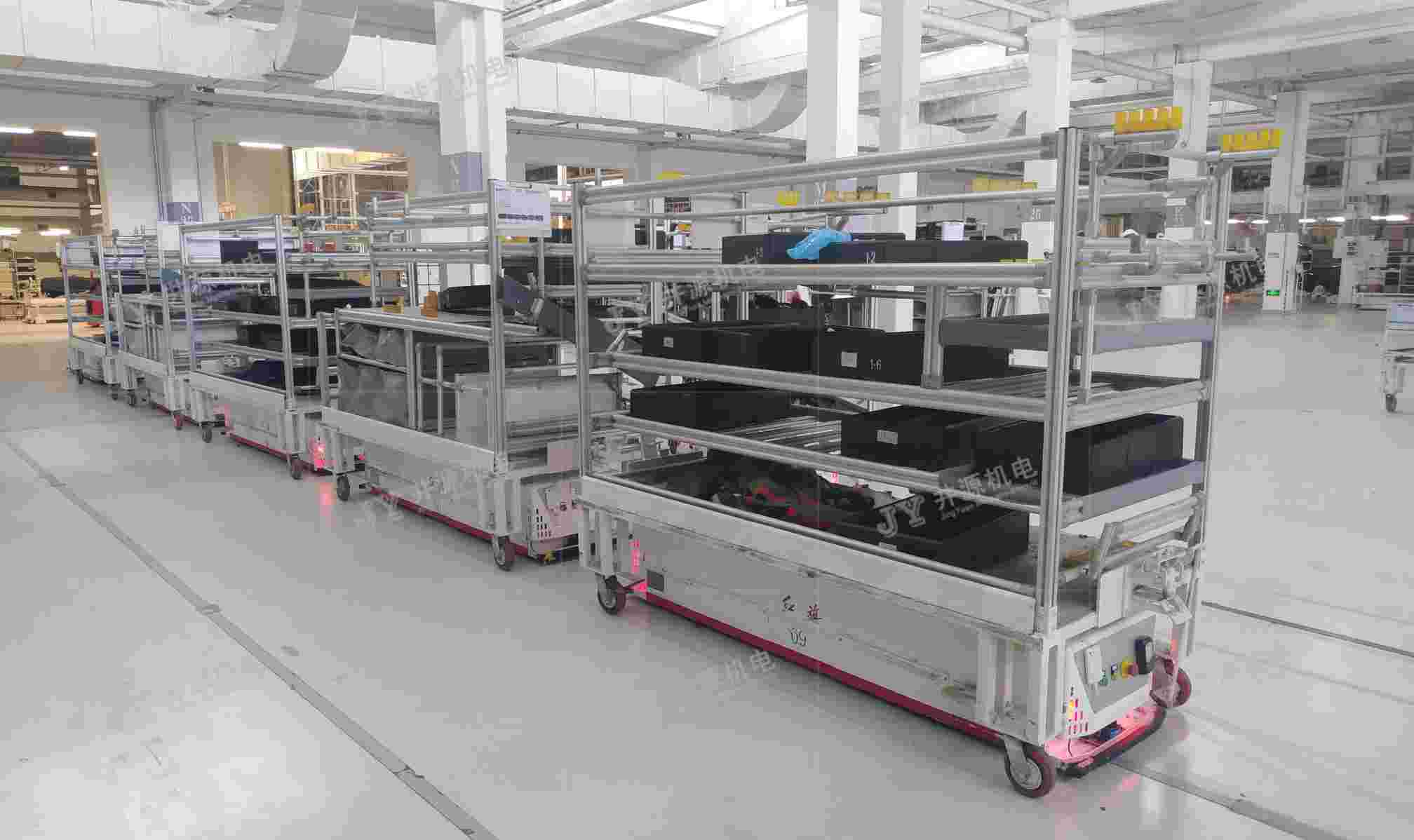 井源機(jī)電AGV具備全方位運(yùn)行功能,采用了雙驅(qū)動(dòng)機(jī)構(gòu),并運(yùn)用雙牽引銷,實(shí)現(xiàn)了AGV與不同長(zhǎng)度器具的自動(dòng)匹配。此外,AGV采用全自動(dòng)充電的方式,具備一鍵開關(guān)機(jī)的功能,通過總控系統(tǒng)對(duì)所有AGV進(jìn)行整體控制,高效而節(jié)能。值得一提的是,其實(shí)現(xiàn)了窄通道的線邊物料輸送和焊裝車間多種物料的空滿輪換,大大提高了作業(yè)效率。