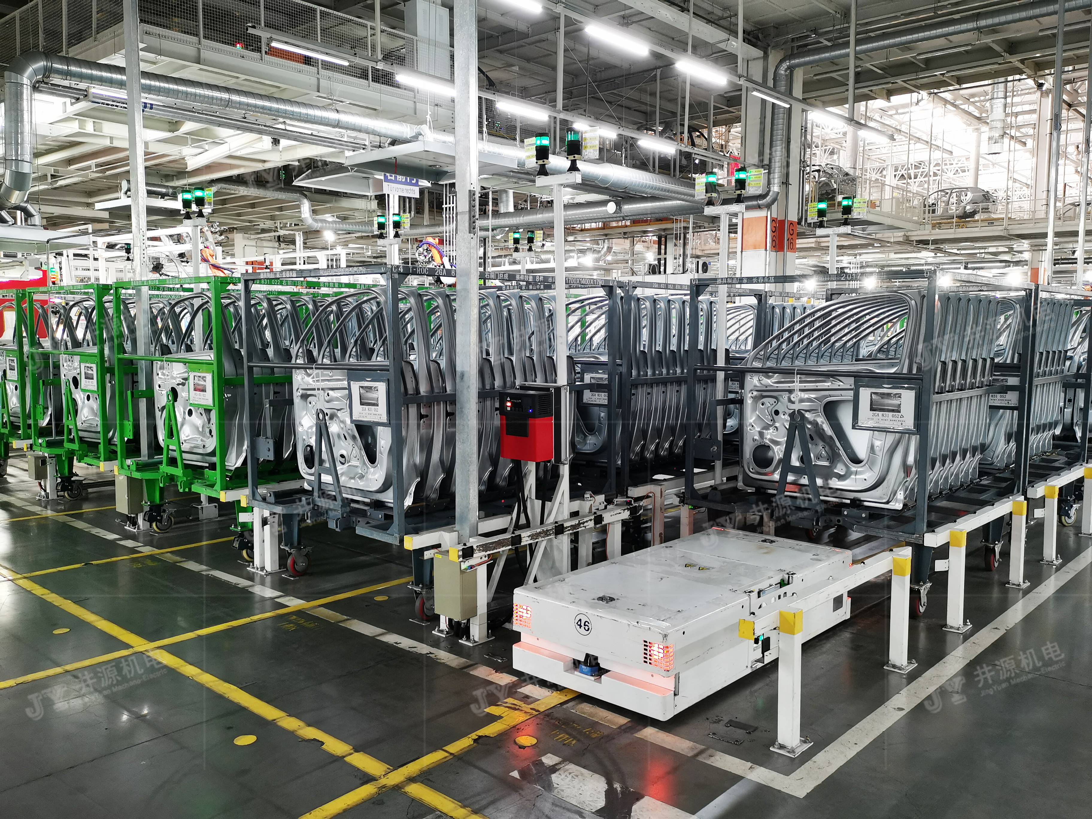 井源機電在此項目上采用了全方位雙舵輪牽引式AGV,實現(xiàn)了整廠物料自動運輸工作,通過AGV 運輸系統(tǒng)與焊裝車間生產(chǎn)系統(tǒng)的車型順序進行數(shù)據(jù)交換,實現(xiàn)網(wǎng)聯(lián),根據(jù)車型隊列,調(diào)整發(fā)車的上線節(jié)拍,智能匹配,實現(xiàn)實時供貨,滿足調(diào)整線三種車型60JPH的生產(chǎn)方案,最終實現(xiàn)第三種車型 VW380CN的四門、前后蓋及翼子板的物流配送,空器具返回等物流過程。