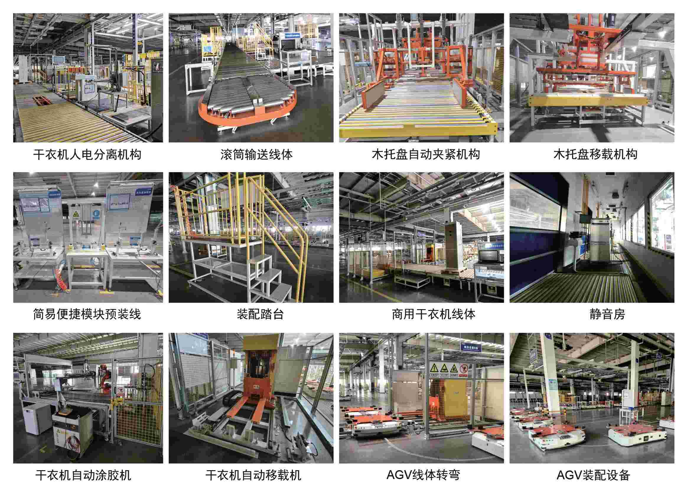 本次項目,商用干衣機智能總裝產(chǎn)線主要運用于多型號干衣機智能化裝配生產(chǎn)工作,計劃以智能AGV為動力驅(qū)動,完成不同型號干衣機的柔性化、信息化、智能化生產(chǎn),實現(xiàn)總裝、檢測、清洗、包運等生產(chǎn)工藝的自動化運輸工作。裝配線包含有:總裝裝配、檢測、清洗、包運、智能平衡吊、簡易便捷模塊預(yù)裝線、檢測設(shè)備、助力設(shè)備、工裝器具、AGV裝配設(shè)備等。